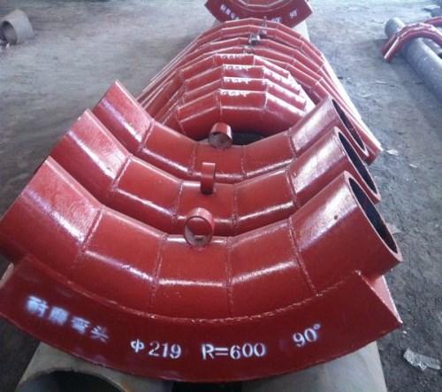 沖壓耐磨彎頭,它是采用與管材相同材質(zhì)的板材用沖壓模具沖壓成半塊環(huán)形彎頭,然后將兩塊半環(huán)彎頭進(jìn)行組對(duì)焊接成形。