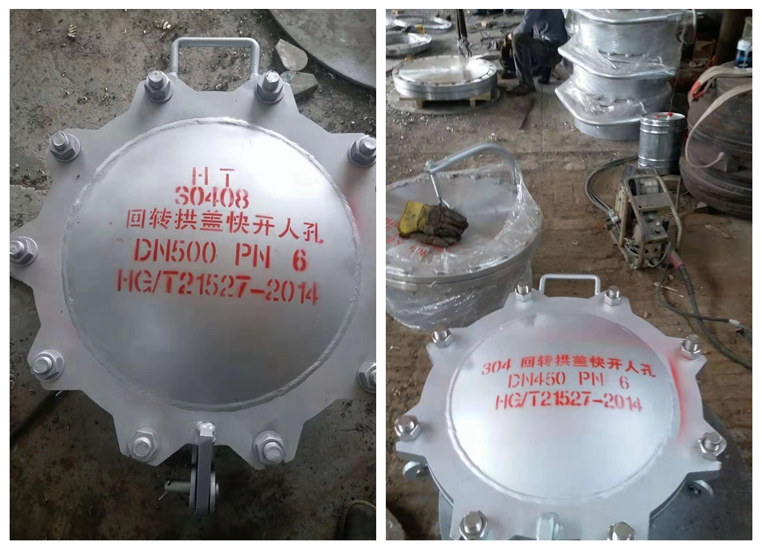回旋蓋人孔可安裝在儲(chǔ)罐頂部和儲(chǔ)罐的側(cè)部,按圖定制?;匦w人孔是一種統(tǒng)稱(chēng),以人孔使用材質(zhì)來(lái)命名的一個(gè)常用叫法.通常安裝在儲(chǔ)罐、容器罐頂部與不銹鋼空氣呼吸閥,洗罐器配套使用,不銹鋼人孔又有起到阻火作用,是保護(hù)儲(chǔ)罐的裝置,特別適用于貯存物料以氮?dú)夥忭數(shù)墓绊敵汗蕖H丝讘?yīng)有一個(gè)設(shè)在進(jìn)出油管右側(cè)附近,并盡量使人孔正對(duì)罐室密閉門(mén),以便人員進(jìn)出、維修油罐和通風(fēng)接管用。